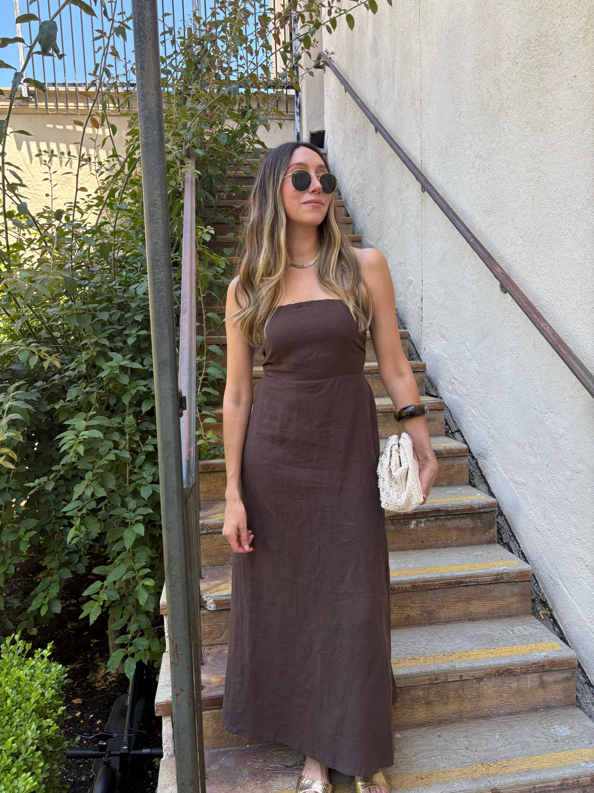 Our best selling Malibu Dress now available in a rich brown color perfect for the upcoming fall season. Effortlessly chic and elevated, made from 100% linen with a strapless silhouette and a smocked back for comfort, finished with a hidden side zipper closure.