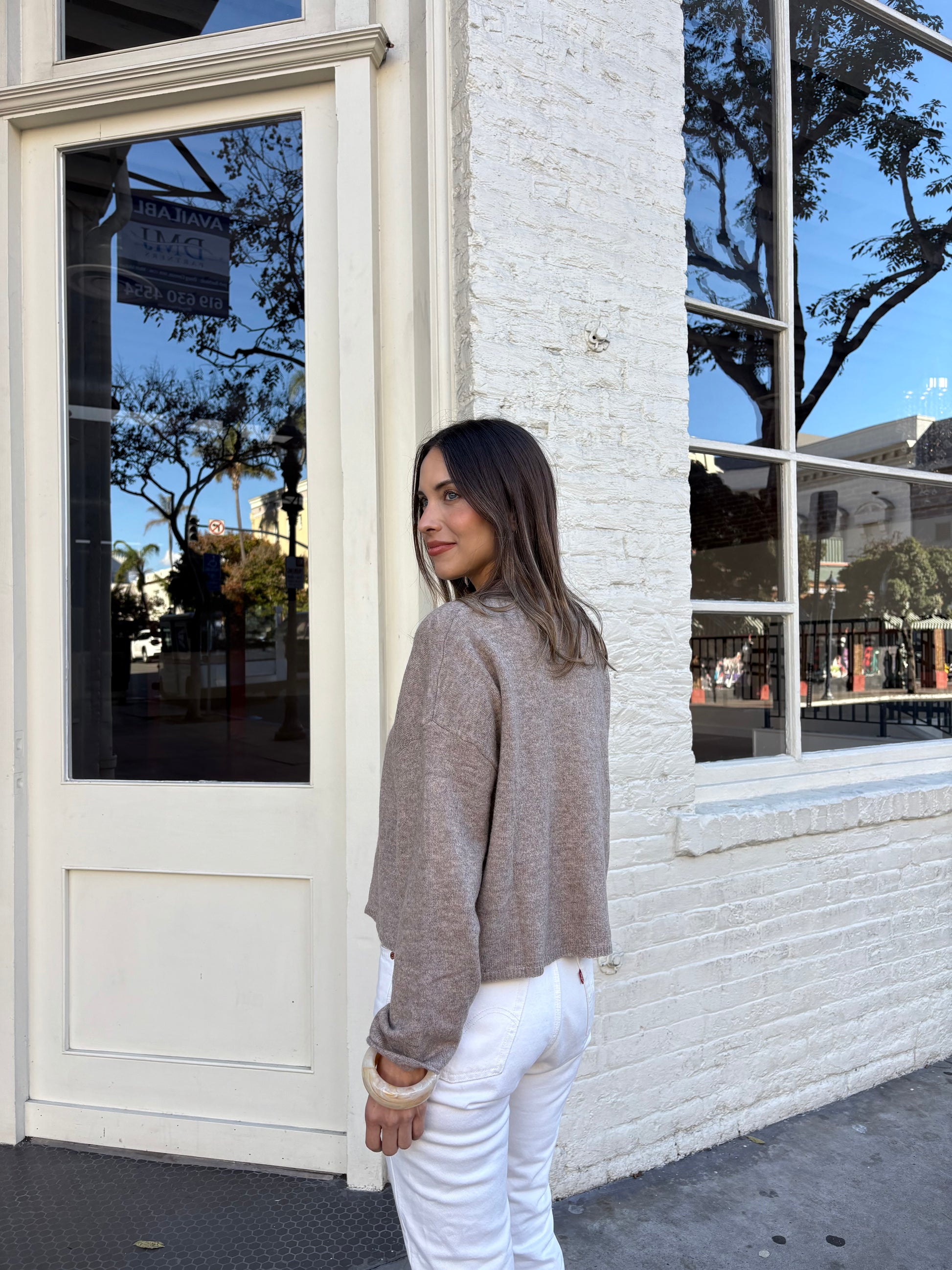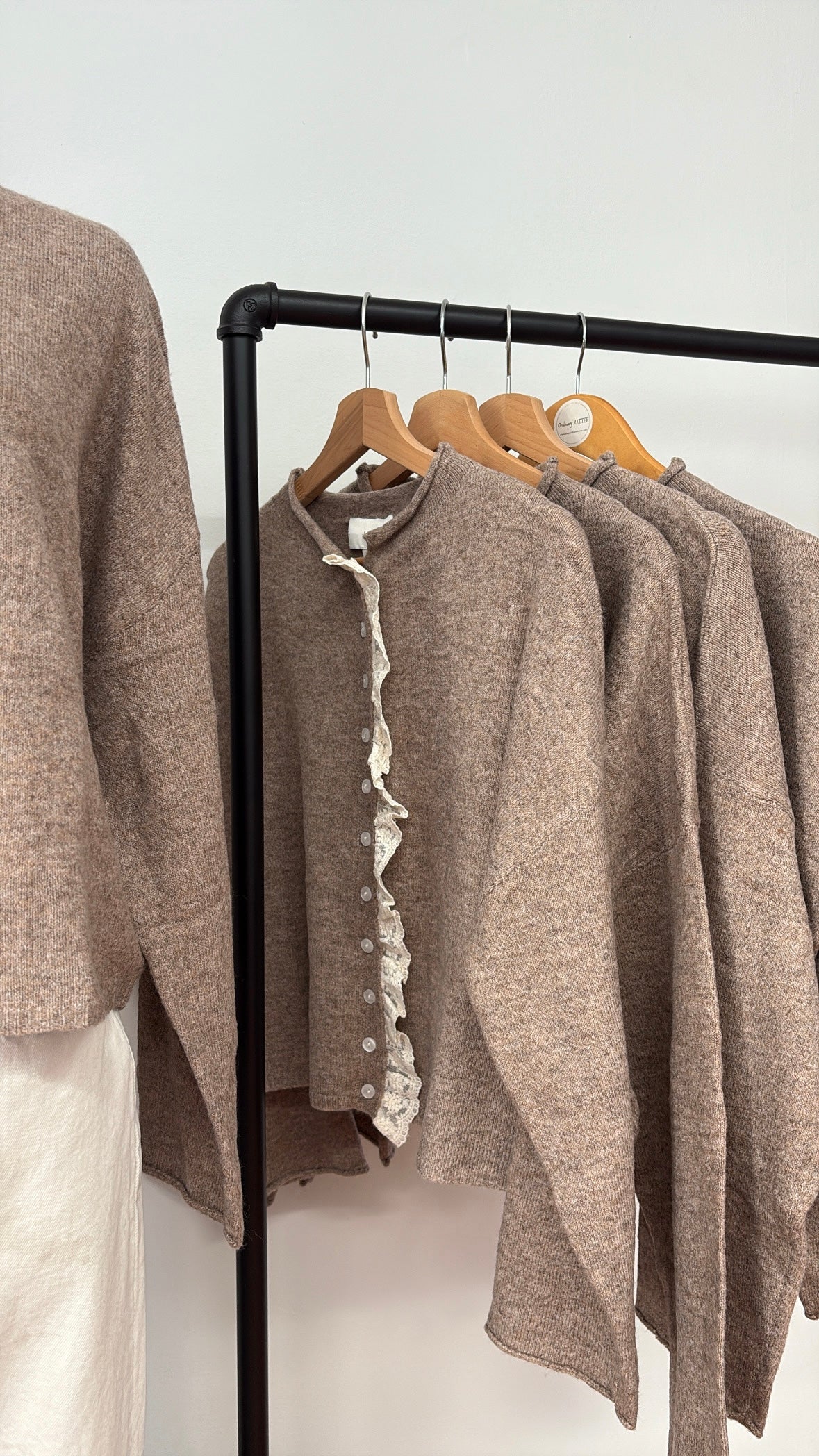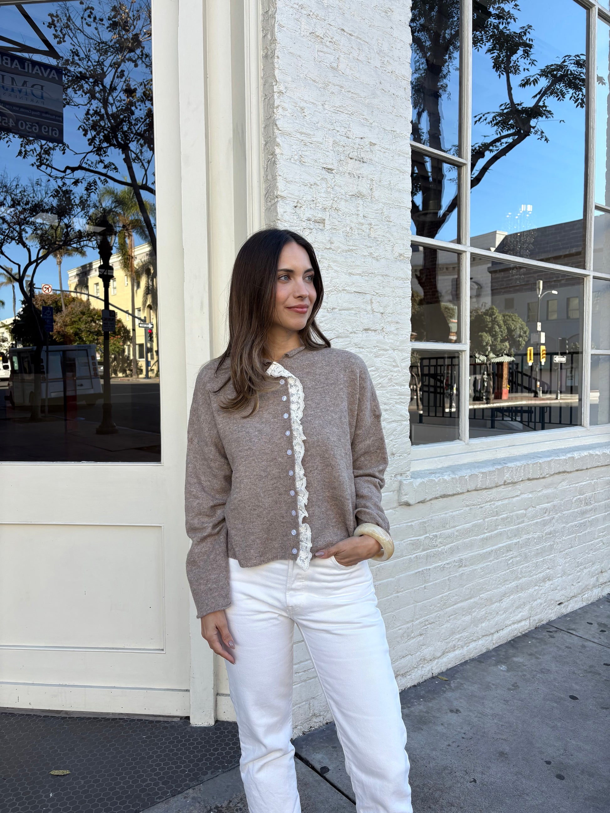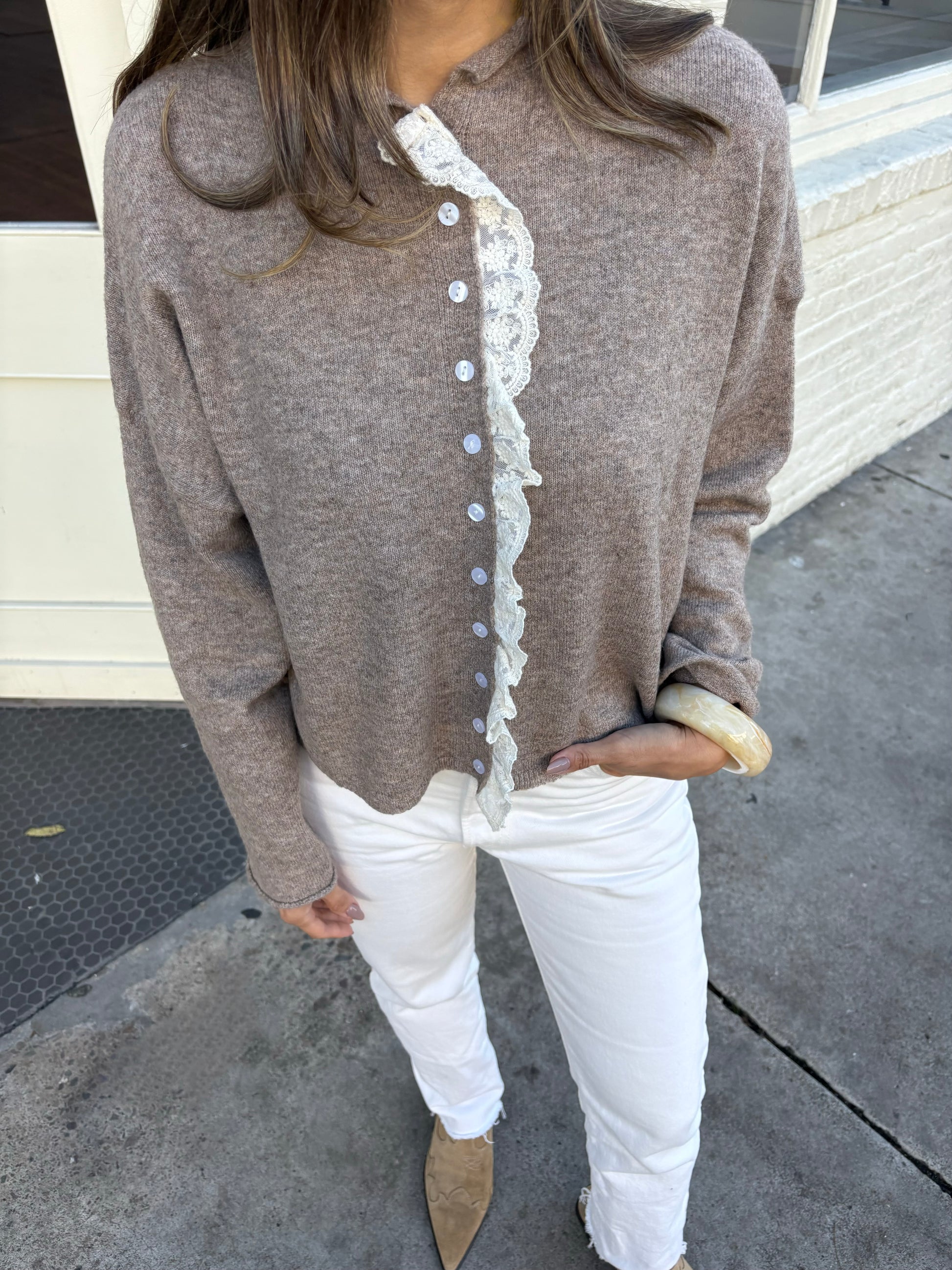 Button down cardigan with lace trim and raw edge detail in a versatile heathered mocha color.